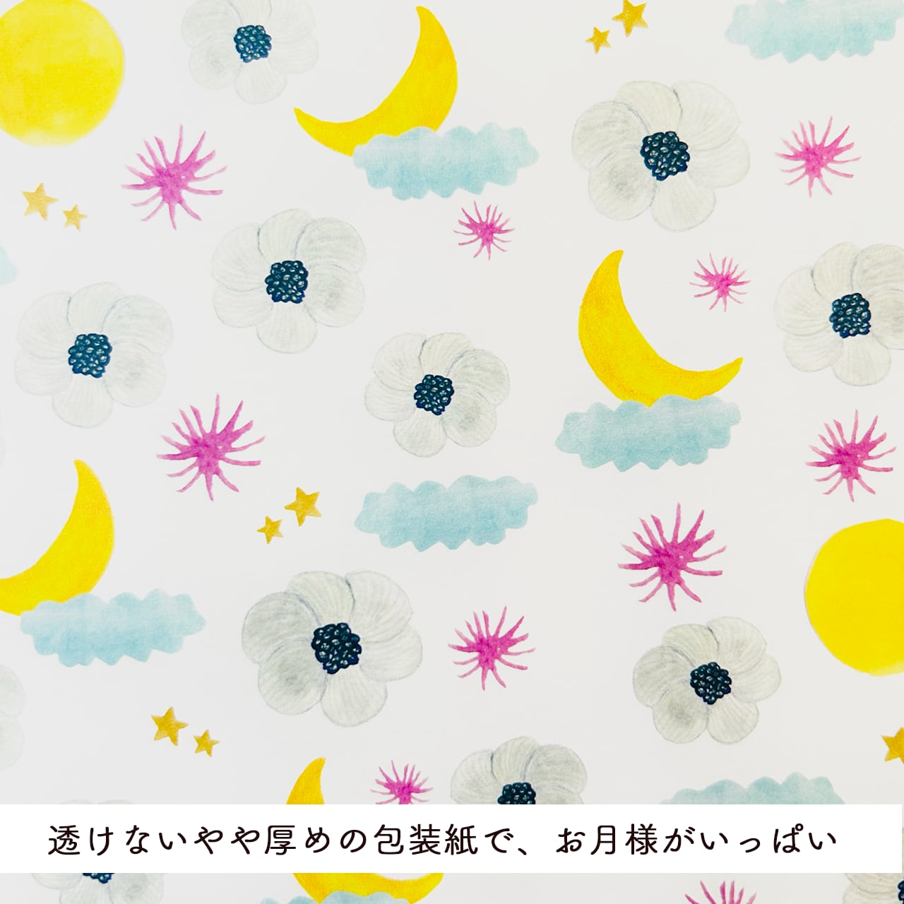 Moonlight Chatter – White Flowers, Crescent Moons & a Quiet Night on Wrapping Paper