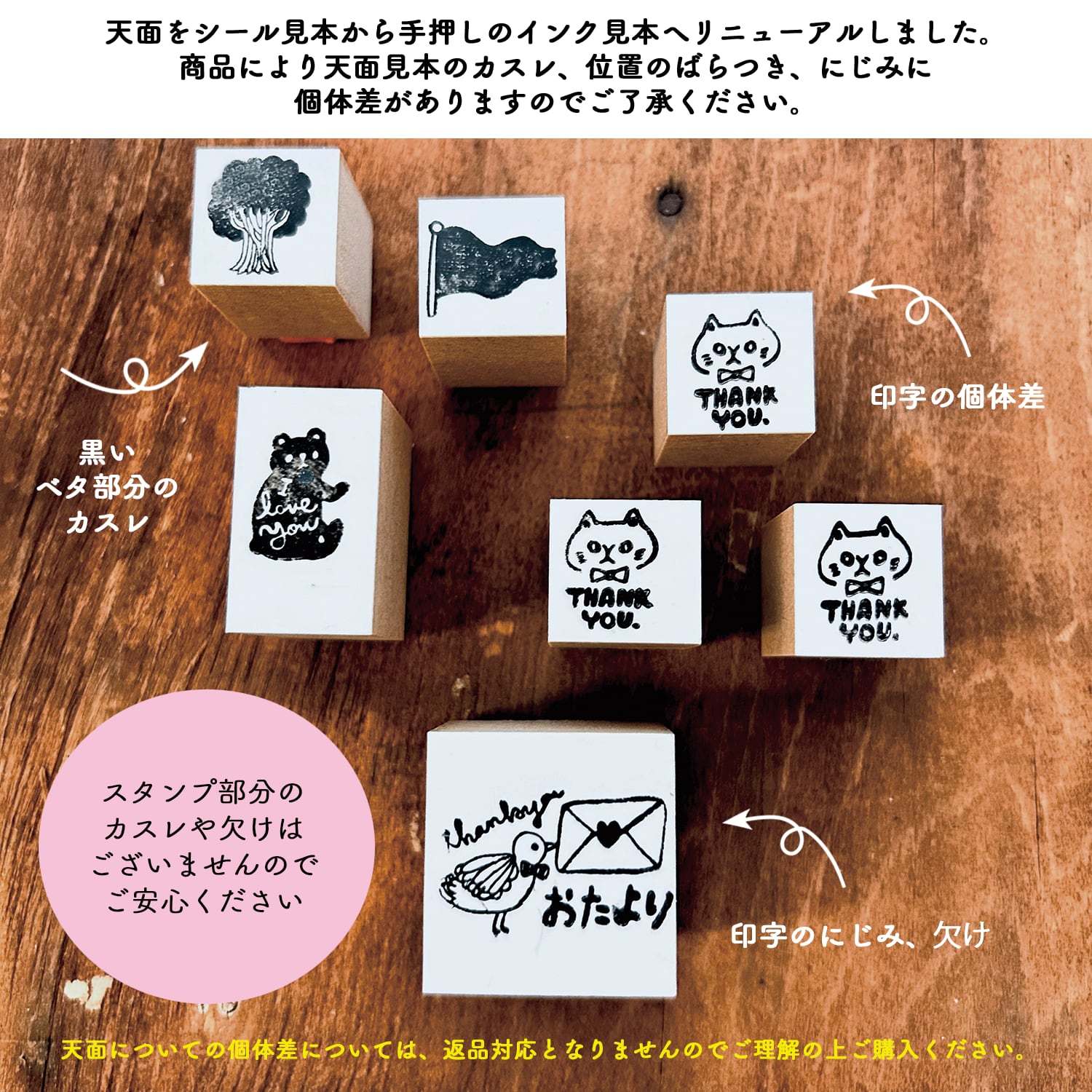 ・天面の見本を2/13よりインクジェットシール→スタンプ印字(ニスコーティング)に変更しております。手作りのため、個体差がございますが、スタンプ部分に関しての問題はございませんのでご安心ください。(お写真でスタンプの押した時の仕上がりをご確認ください)