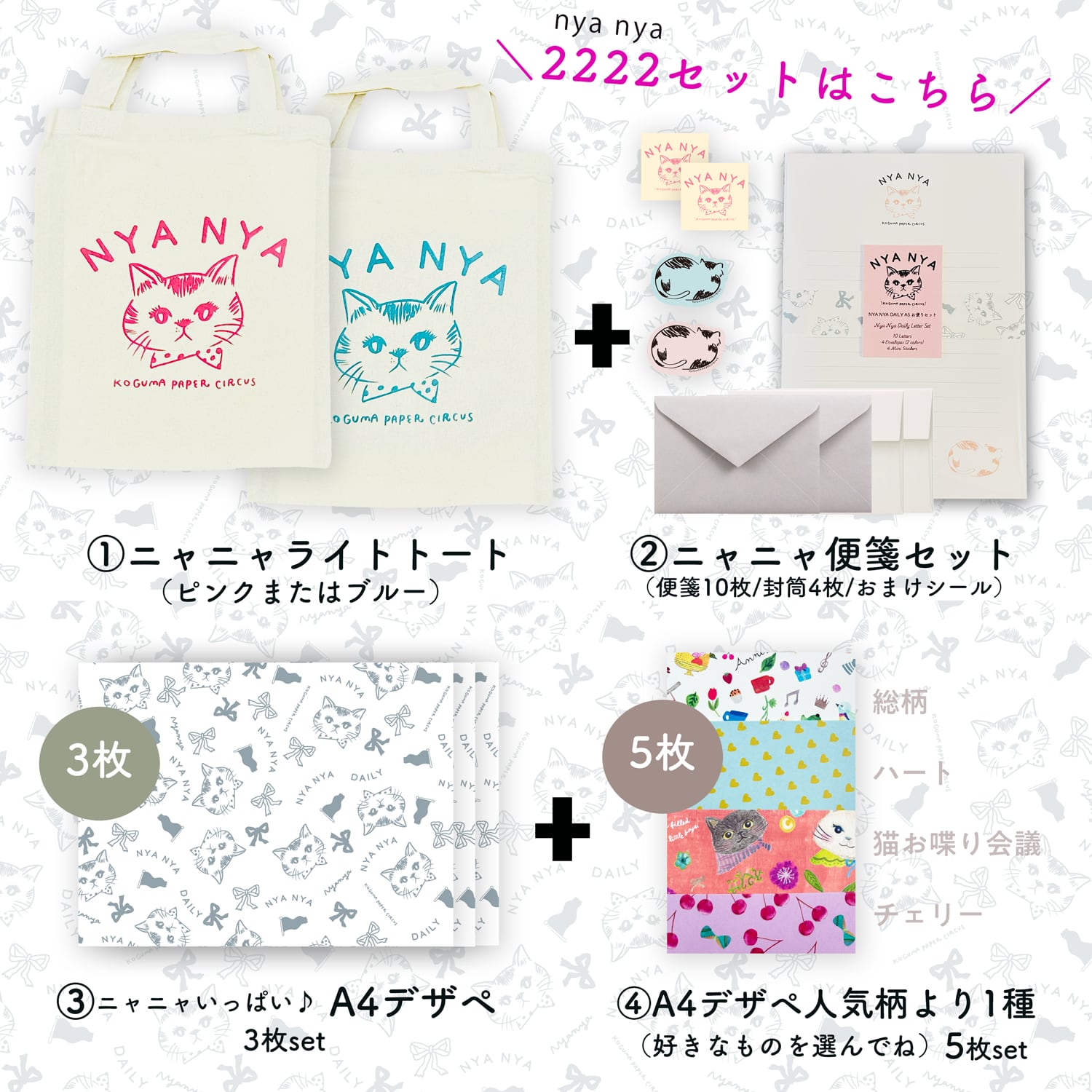 A5のたっぷり便箋セット+ニャーニャーデザペ+選べるデザペがついている、猫いっぱいセットです。にゃーにゃーにちなんで、2,222円の特別価格。